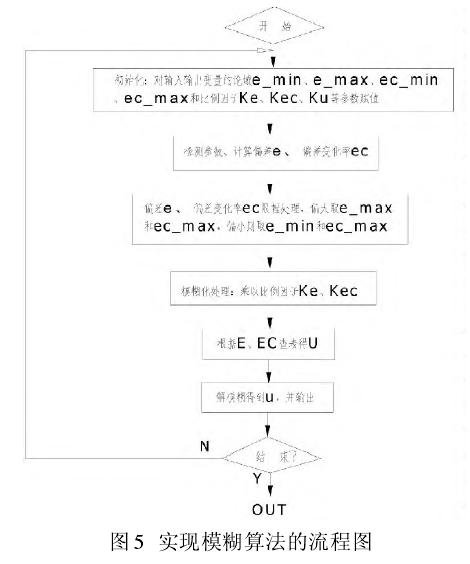 S7-300 的編程系統(tǒng) Step7-v5.3 提供了豐富的指令和功能模塊[7 ]。我們比較模糊控制器的結(jié)構(gòu)與S7-300 結(jié)構(gòu)化編程思想,可以設(shè)計(jì)出模糊算法的結(jié)構(gòu)見圖4。STEP7的程序總是從組織塊OB1開始的,采用循環(huán)執(zhí)行的方式實(shí)現(xiàn)對(duì)整個(gè)程序的總體控制、子程序塊的調(diào)用和數(shù)據(jù)的采集與傳遞。FB10被用來實(shí)現(xiàn)模糊控制功能。它又由FC10-FC13 四個(gè)子程序塊組成。其中FC10完成溫度偏差e和偏差變化率 ec 的計(jì)算;FC11 進(jìn)行模糊化處理,即完成精確量 e,ec 到模糊量 E,EC 的轉(zhuǎn)換;FC12 完成控制量表的查詢功能;FC12完成模糊控制量U到精確量 u 的轉(zhuǎn)化,并輸出 u。FB10 依次調(diào)用四個(gè)子模塊完成模糊控制各部分的功能,并實(shí)現(xiàn)他們之間的數(shù)據(jù)傳遞。FB10 模糊控制器編制完成后,保存在 STEP7標(biāo)準(zhǔn)庫中。這樣構(gòu)成的FB10就具有很強(qiáng)的靈活性和通用性,如同 S7-300 可編程控制器的內(nèi)置特殊功能的模塊一樣,可以在其他實(shí)現(xiàn)模糊功能的程序中方便調(diào)用,只需修改參數(shù)即可。實(shí)現(xiàn)模糊算法的流程圖如圖 5 所示。