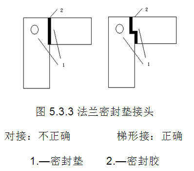 5.2.20風管與角鋼法蘭連接時,風管翻邊應(yīng)平整,并緊貼法蘭,寬度不應(yīng)小于7mm,并剪去重疊部分,翻邊處裂縫和孔洞應(yīng)涂密封膠。