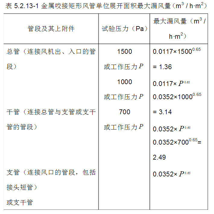 表5.2.13-1金屬咬接矩形風管單位展開面積最大漏風量(m3/ h.m2)
