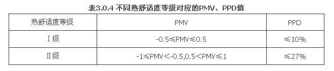 3.0.4 供暖與空調(diào)的室內(nèi)熱舒適性應(yīng)按現(xiàn)行國家標(biāo)準(zhǔn)《中等熱環(huán)境 PMV和PPD指數(shù)的測定及熱舒適條件的規(guī)定》GB/T 18049的有關(guān)規(guī)定執(zhí)行,采用預(yù)計平均熱感覺指數(shù)(PMV)和預(yù)計不滿意者的百分?jǐn)?shù)(PPD)評價,熱舒適度等級劃分應(yīng)按表3.0.4采用。