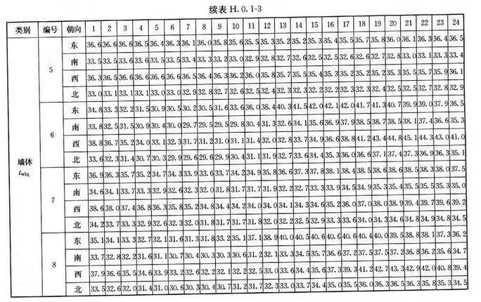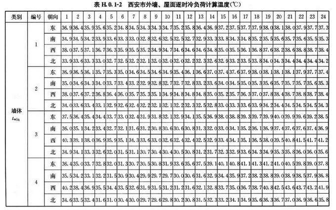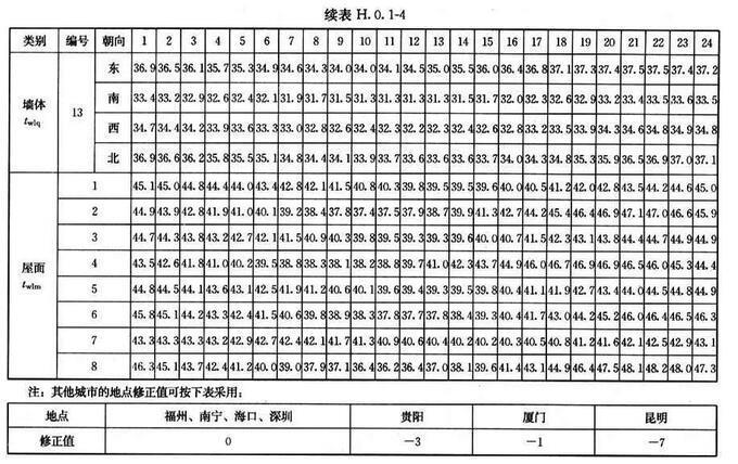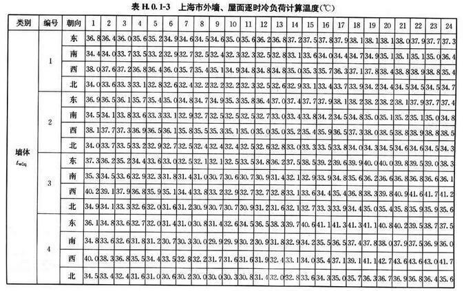 H.0.1 北京、西安、上海及廣州等代表城市外墻、屋面逐時冷負(fù)荷計算溫度twlq、twlm,可按表H.0.1-1~表H.0.1-4采用。外墻、屋面類型及熱工性能指標(biāo)可按表H.0.1-5、表H.0.1-6采用。