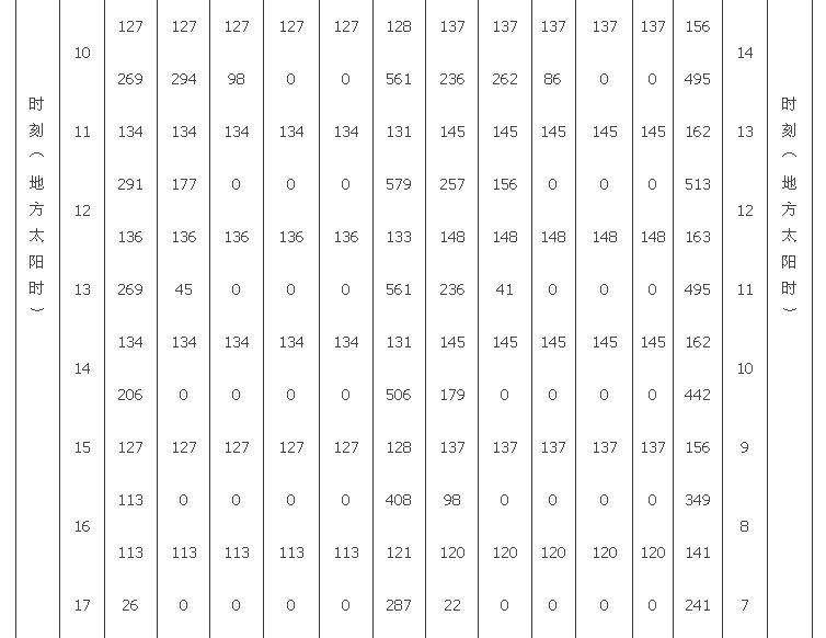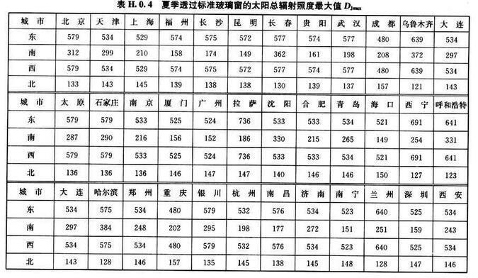 H.0.4 夏季透過標(biāo)準(zhǔn)玻璃窗的太陽總輻射照度最大值DJmax,可按表H.0.4采用。