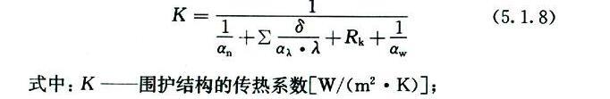 5.1.8 圍護(hù)結(jié)構(gòu)的傳熱系數(shù)應(yīng)按下式計算: