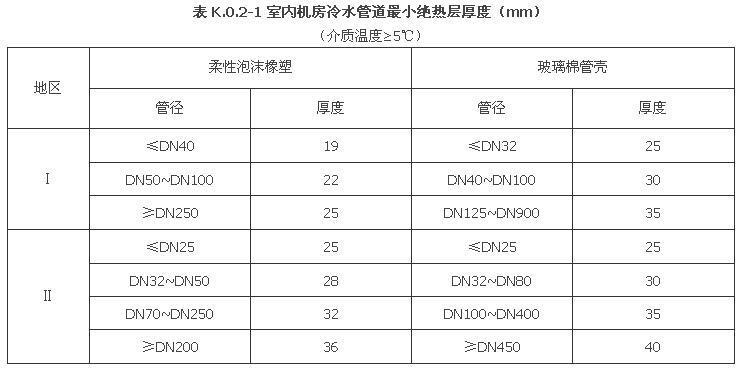 K.0.2 室內(nèi)機房內(nèi)空調(diào)設(shè)備與管道保冷厚度可按表K.0.2-1~表K.0.2-2中給出的厚度選用。