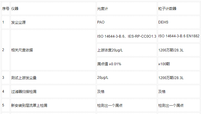 此次實驗根據(jù)為ISO14644-3-B.6.2應用大氣氣溶膠分光光度計對到位過濾裝置掃描儀測漏的方法和ISO14644-3-B.6.3應用粒子計數(shù)器對到位過濾裝置掃描儀測漏的方法。