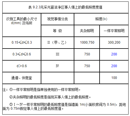 表9.2.3無(wú)光照窗潔凈區(qū)事人情世故上的最少光照強(qiáng)度度值